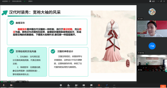 课程开始时,实践团袁梦然抛出了一个充满童趣的问题:“小朋友们想一想,中国古代的服饰是什么样子的呢?与我们当今的衣服有什么不同?”通过观看一段中国服饰发展过程的展示视频,孩子们的好奇心被瞬间点燃,仿佛坐上了“时空穿梭机”,从现代一下穿越回了古代,激发了同学们的对探索中国传统服饰兴趣。