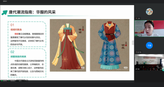 顺着历史的车轮,课程来到了繁华的唐朝。实践团袁梦然通过播放图片,展示了如云朵般轻盈的“襦裙”。这种服饰让唐代女性在行动中尽显灵动,也体现了当时社会对女性的包容与开放。接着,一套利落的“胡服骑装”吸引了孩子们的目光:窄袖短衣、合身长裤搭配皮靴,这套吸收了北方游牧民族特点的服饰,不仅方便骑马射箭,更展现了唐代开放包容的文化气度——原来千年前的中国,就已经用服饰书写着民族融合的故事。